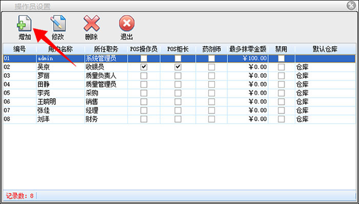 在系统设置-操作员设置里面,点击增加按钮,可以建立操作员信息。