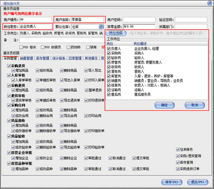 需要注意的是,一定要点击岗位选择,勾选相应的权限。这个权限是用于控制首营审批的权限,倘若不勾选,将不具备首营审批的权限。