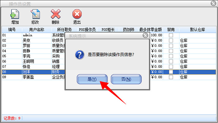 选中需要删除的操作员,点击删除按钮,弹出提示“是否要删除该操作员”,选择是,即可删除该操作员。(admin属于系统操作员,不可删除)