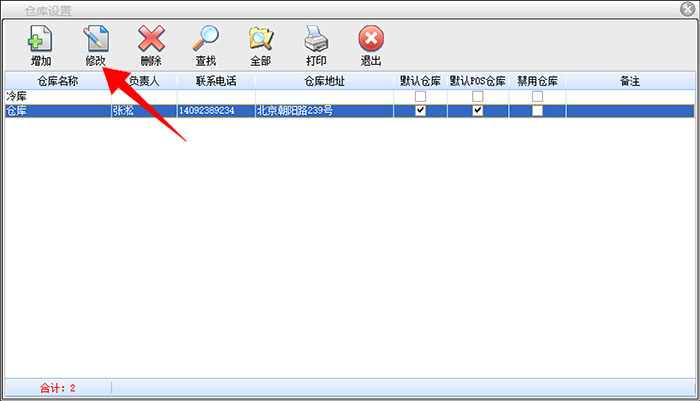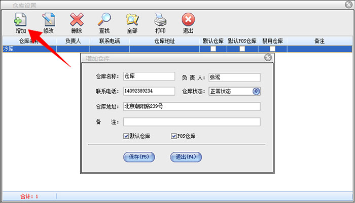 在系统设置-仓库设置里面,点击增加按钮,填写仓库名称、负责人、仓库地址,勾选默认仓库和pos仓库,点击保存,即可完成仓库的建立。(仓库名称可以自定义)