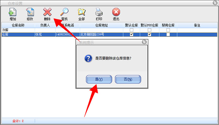 在仓库设置界面,选中想要删除的仓库,点击删除选项卡,可以对该仓库进行删除。(倘若仓库里面存在商品信息,则无法删除该仓库)