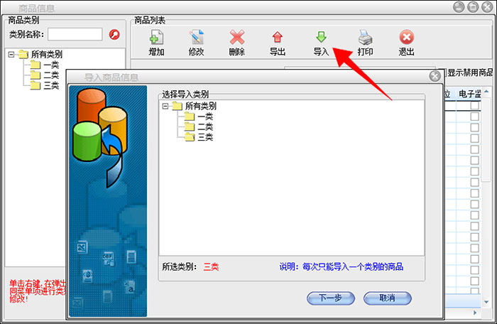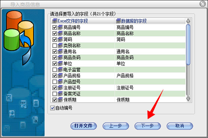 在弹出的“导入商品信息”界面,Excel文件的字段与数据库的字段需要对应好关系,然后点击下一步,默认是全选状态,点击导入按钮,最后提示“导入成功”,即完成了商品信息的导入。