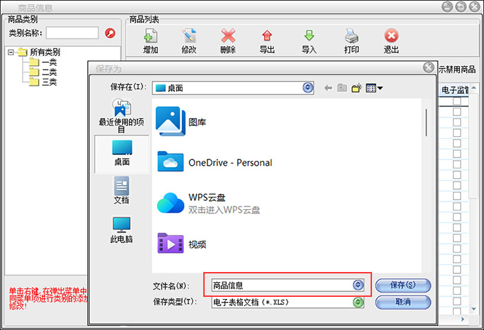 在商品管理界面,点击导出按钮,在弹出的对话框中,保存类型默认电子表格文件(*.XLS),保存名称命名为商品信息(也可以命名为其他名字),然后点击保存按钮,系统会提示数据导出成功,这时候商品导出就成功了。