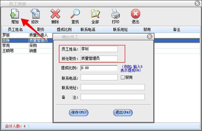 在系统设置-员工设置里面,点击增加按钮,弹出“增加员工”界面框,填写好员工姓名及所任职务,点击保存按钮,即可完成员工创建。