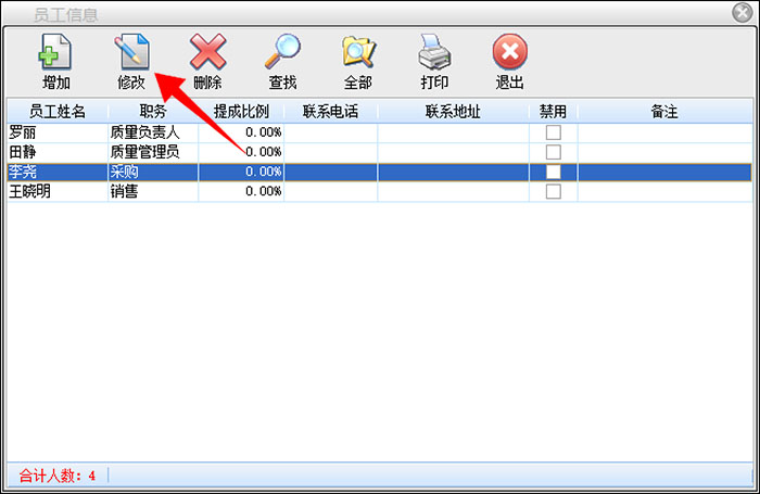 在员工设置界面,选中想要修改的员工信息,点击修改按钮,会弹出“修改员工”界面框,我们即可对员工信息进行修改。