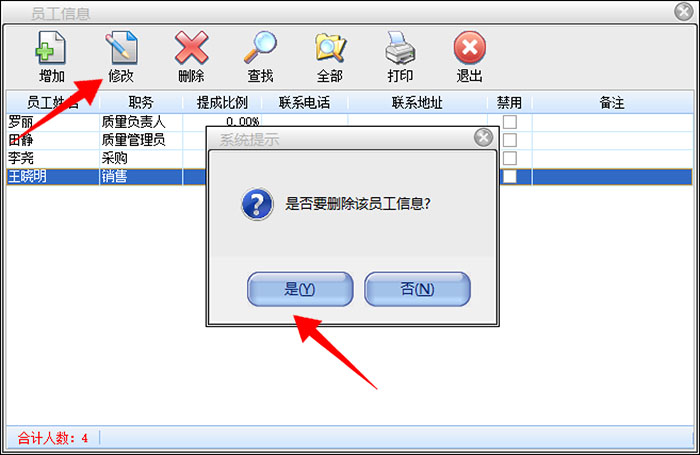 在员工设置界面,选中想要删除的员工信息,点击删除按钮,会弹出提示框“是否要删除员工信息”,选是,即可删除该员工。