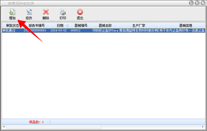 在进货管理-首营品种审批里面,增加首营品种审批表,器械名称右侧点击红色搜索框,在出现的界面中选择类别及具体的商品,会自动获取到生产厂商、生产许可证号、注册证号,有效日期等,并补充器械信息(质量、用途)疗效)等信息,交由相应部门审批。