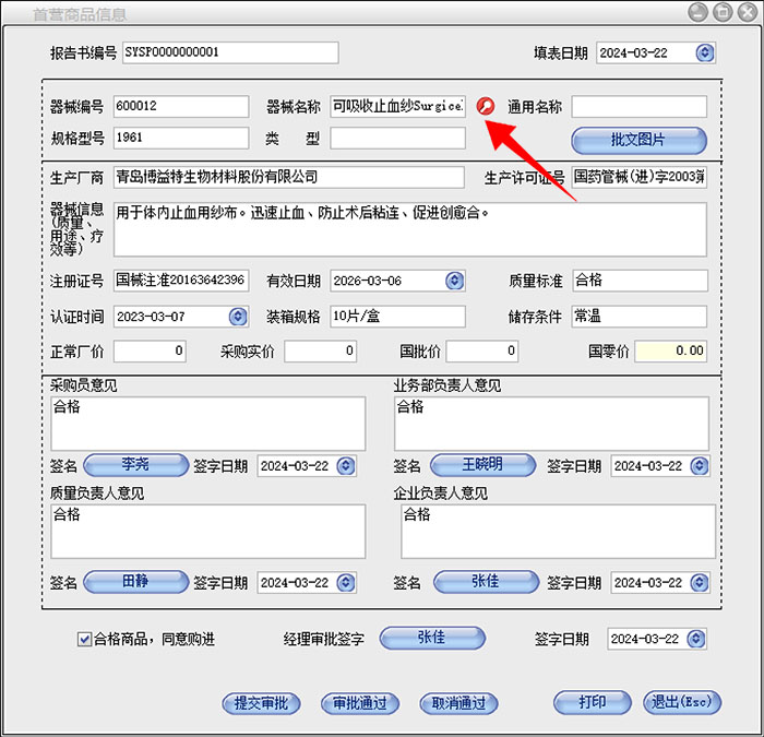 采购员意见、业务部门负责人意见、质量负责人意见、企业负责人意见等都需要填写,并由部门相关人员签字确认。最后勾选合格商品,同意购进,并点击审批通过,即可完成首营品种的审批流程。
