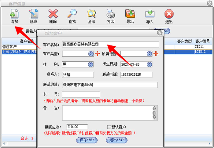 在系统设置-客户设置里面,点击增加按钮,会出现“增加客户”界面框,填写客户名称、联系人、联系电话、联系地址等,点击确定,即可完成客户信息的创建。