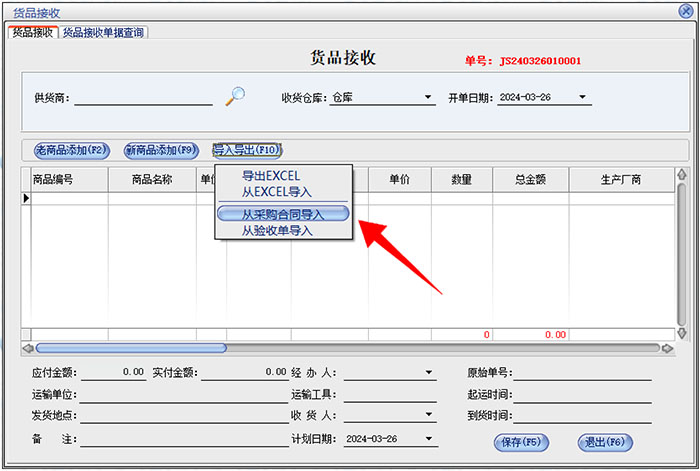 在进货管理-货品接收里面,点击导入导出按钮,从上一级单据里面导入,也就是选择“从采购合同导入”,然后从出现的对话框中查询并选中上一笔采购合同单据,选择导入本单。(采购合同单据号以HT开头,接收单单据号以JS开头,验收单据号以YS开头,入库单据号以CJ开头)