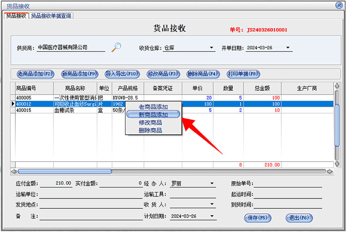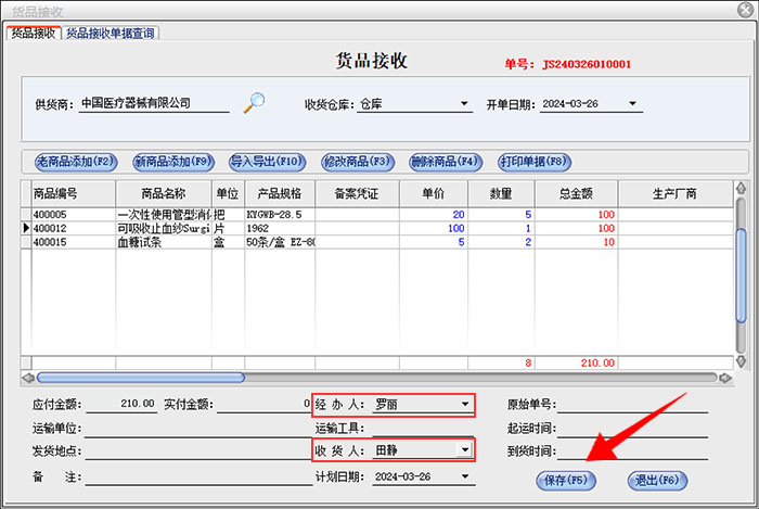 所有商品修改完成后,选择经办人和收货人,核对单据无误后,点击保存按钮,即可完成货品接收的操作。倘若单据出现错误,可在货品接收单查询里面,找到该笔单据,进行修改或者删除操作。