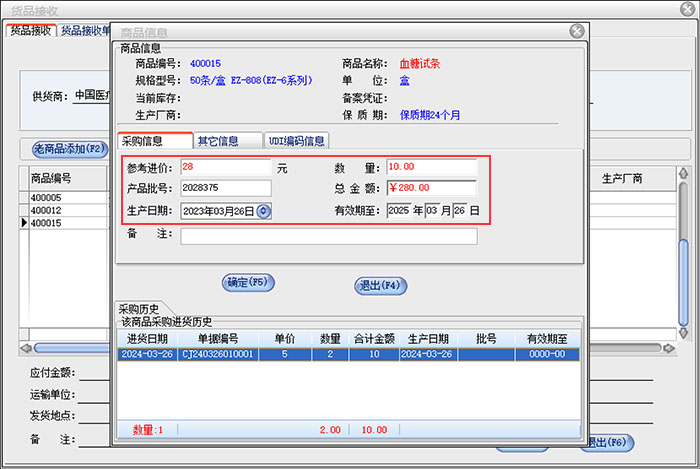 导入成功后,双击导入的商品(或者右键点击修改按钮)填写具体的产品批号、生产日期、有效期至等信息。