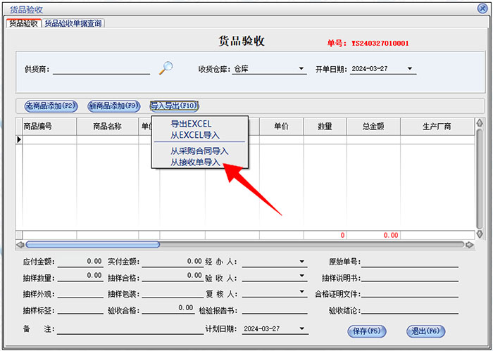 在进货管理-货品验收里面,点击导入导出按钮,从上一级单据里面导入,也就是选择“从接收单导入”。