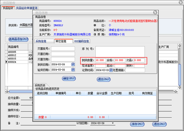 导入成功后,双击导入的商品,检查其他信息选项卡里面,到货数量、合格数量,次品数量是否正确,按照实际情况填写。