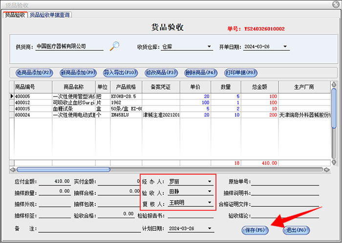 最后,选择经办人、验收人和复核人,核对单据后,点击保存按钮,即可完成货品验收的操作。倘若单据出现错误,可在货品验收单据查询里面,选中该笔单据,点击上方的修改按钮或者删除按钮进行操作。