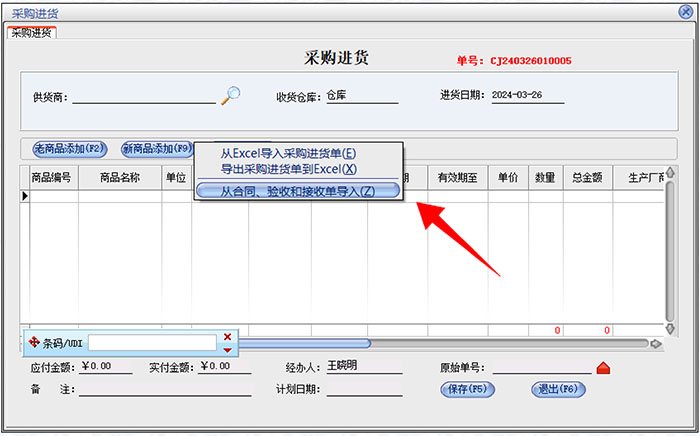 在进货管理-采购进货里面,点击导入导出按钮,选择“从合同、验收和接收单导入”。