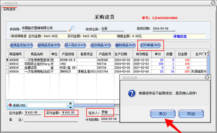 成功导入上一级单据后,选择经办人,这时会出现一个打印单据的按钮,可打印采购入库单据。而底部应付金额会自动计算,实付金额需要根据实际情况填写。核对单据无误后,可点击保存按钮,完成货品入库的操作。