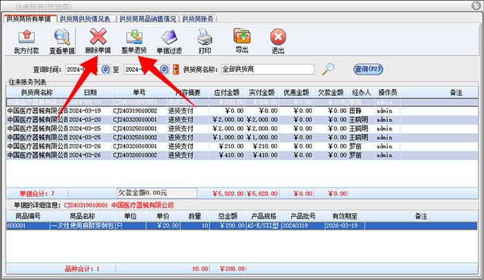倘若单据出现错误,可以在往来账务里面查询到这笔采购进货单据,执行相应的删除单据和整单退货操作。需注意,货品入库单据一旦添加成功无法修改,只能删除或者退货。