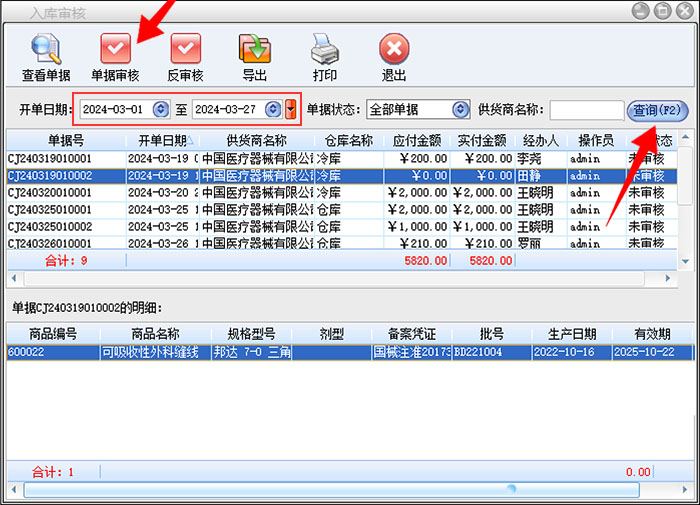 在进货管理-入库审核里面,选择开单日期范围,并点击查询按钮,可以查询到之前的单据状态。选中之前建立的采购进货单据,核实到状态为“未审核”状态,点击审核按钮,状态即刻变成“已审核”,单据审核完成,整个入库流程操作完毕。