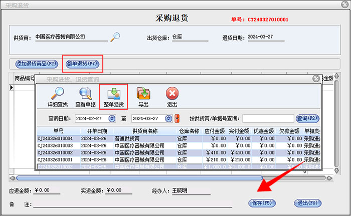 在进货管理-采购退货里面,点击“整单退货”按钮,在弹出的“采购进货、退货查询”界面,找到需要退货的那笔单据,选中该单据,并点击“整单退货”按钮,核对单据无误后,点击保存按钮,即完成了整单退货。