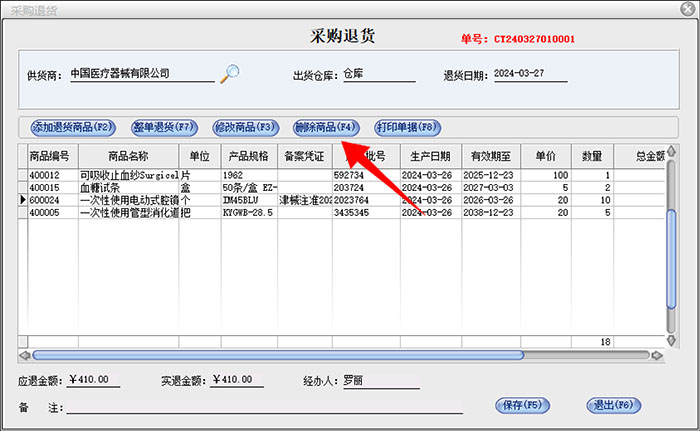 倘若只是想要对部分商品进行退货处理,也可以点击“整单退货”按钮,找到需要进行部分退货处理的那笔单据,导入该单据后,再选中不需要进行退货的商品,右键点击“删除商品”选项卡,核对退货商品无误后,点击保存按钮。