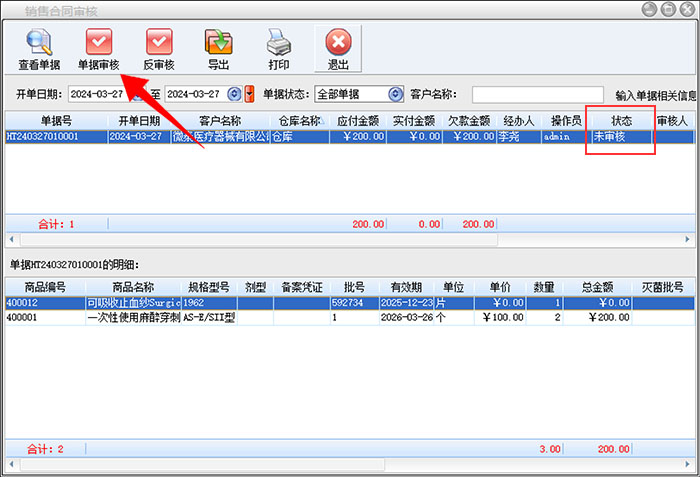 在销售管理-合同审批里面,选择开单日期的起始范围,并点击查询按钮,找到对应的合同单据,选中该单据,点击审核,让单据从“未审核”状态变成“已审核”。那么这笔合同单据就完成了审批,可以进行下一环节的操作了。