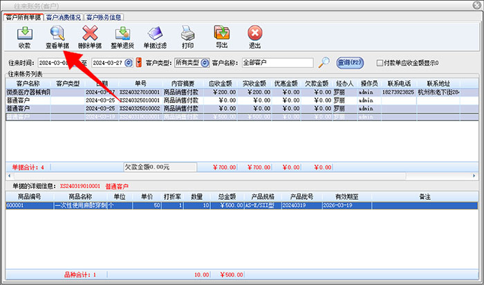 在销售管理-往来账务里面,可以查看之前的销售单据,并点选中想要打印的单据,点击查看单据按钮。