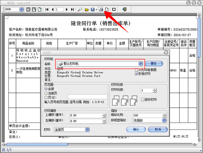 系统弹出“单据预览界面”,点击“打印报表”按钮,选择打印机,点击确认,即可打印该销售单据。