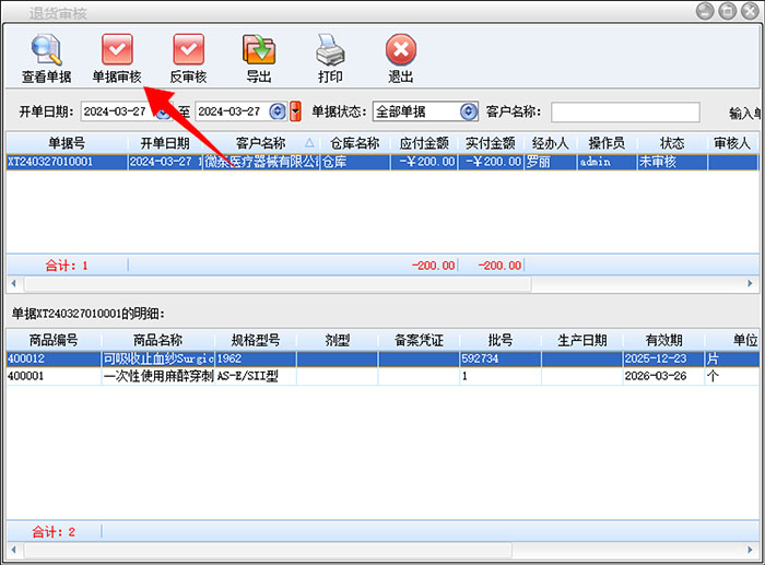 在销售管理-退货审核里面,选择好开单日期,点击查询按钮,能查询到该日期范围内所有的销售退货单据,选择需要做退货审核的那笔单据,点击单据审核,该单据状态将会从“未审核”状态变成“已审核”状态,代表审核操作完成。