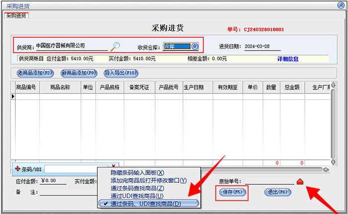 在进货管理-货品入库界面,先选择供货商和仓库,然后点击红色小房子图标,可打开或者关闭识别框,点击识别框右侧小三角图标,选择“通过条码、UDI查找商品”。