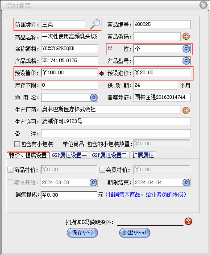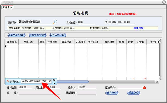 在识别框内扫UDI编码,按回车健,会自动获取到药监局数据库里面的UDI商品资料,包括商品名称、规格、厂家、注册证号或备案凭证号、生产批号、生产日期、有效期等信息。