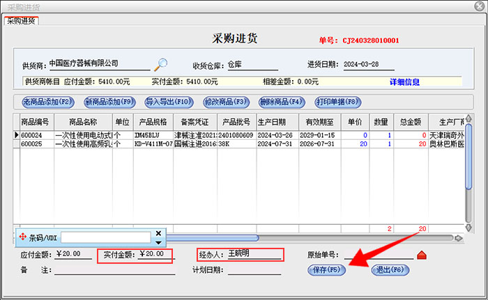倘若还需要添加其他医疗器械产品,则继续扫UDI码,重复上述操作。最后选择经办人,填写实付金额,点击完成按钮。这就是UDI扫码入库的完整教程。