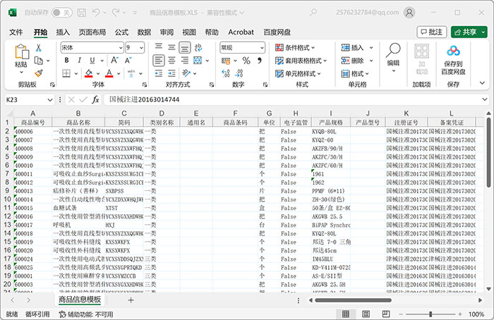 然后,我们删除模板中原有的商品数据,按照这个格式添加上所有商品信息,包括商品编号、商品名称、商品条码、单位、产品规格、注册证号、备案凭证、最低库存、预设进价、预设售价、生产厂商、注册人等信息。(注意,复制粘贴数据时不要覆盖Excel文件本身的格式)